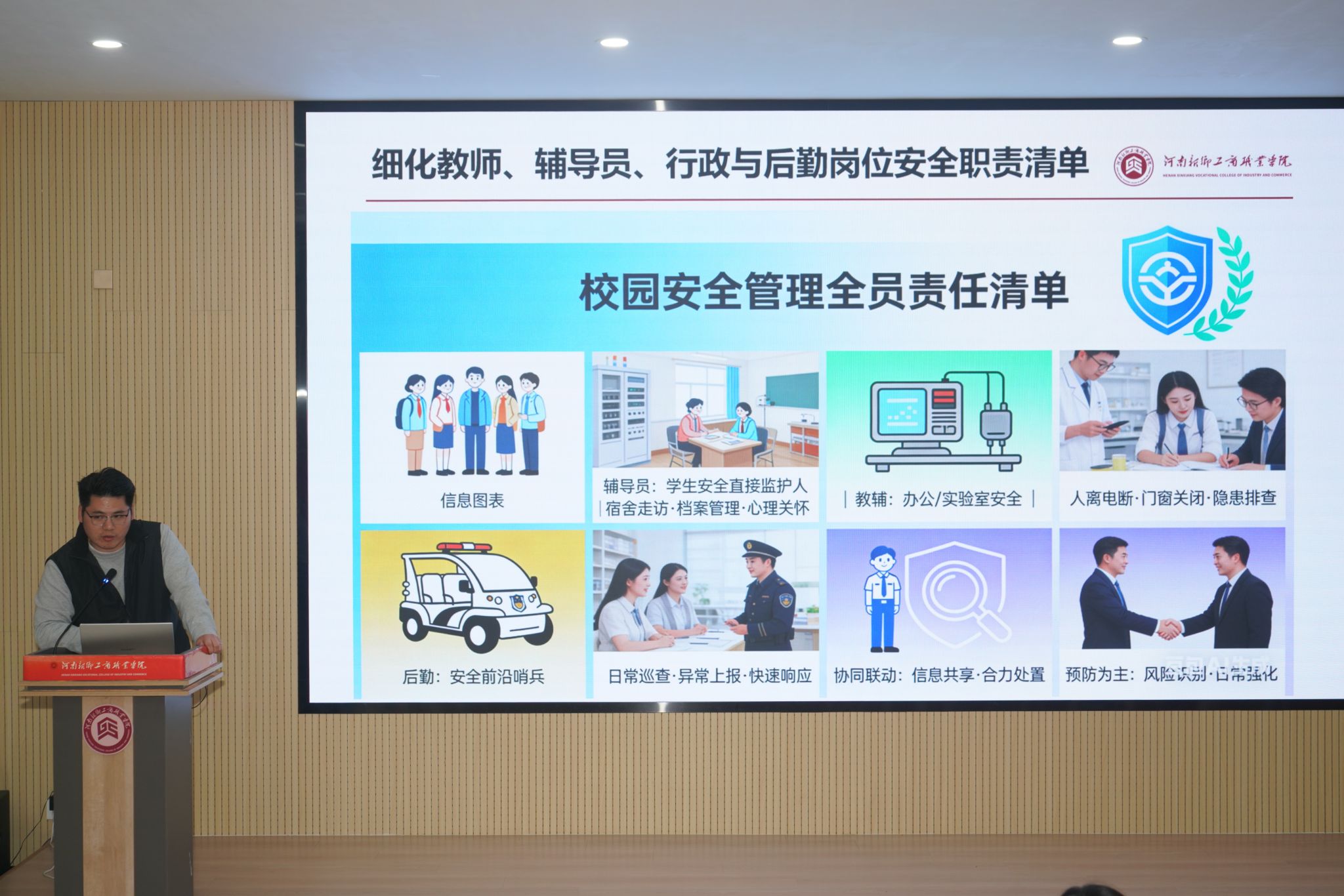 李磊处长围绕校园安全核心领域,重点聚焦消防安全、治安防控、反诈防骗、食品交通等关键环节展开。他结合典型案例进行深入剖析,详细解读各岗位安全工作职责,并重点强调要全面推行“首见首问负责制”。同时,他还系统讲解了“冷静判断、初步处置、立即报告、协助配合”的应急处置四步法,明确隐患排查标准与整改闭环要求,助力全体教职工进一步强化风险识别能力和应急处置水平。