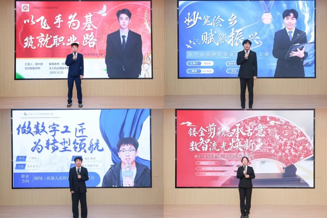 为全面落实立德树人根本任务,强化就业育人实效,引导学生树立科学的职业发展观,提升就业竞争力,12月25日,第三届全国大学生职业规划大赛河南新乡工商职业学院校赛决赛在教学楼7A104学术报告厅顺利举办。本次大赛以“筑梦青春志在四方·规划启航职引未来”为主题,自11月启动以来,全校学生踊跃参与,累计吸引4161名学生网络报名,参与率超过98%,覆盖数字经济、数字智能、低空智能与能源装备各学院。经过院级初赛、复赛层层选拔,最终24名选手脱颖而出,成功晋级校级决赛,共同呈现了一场精彩纷呈的职业规划盛宴。