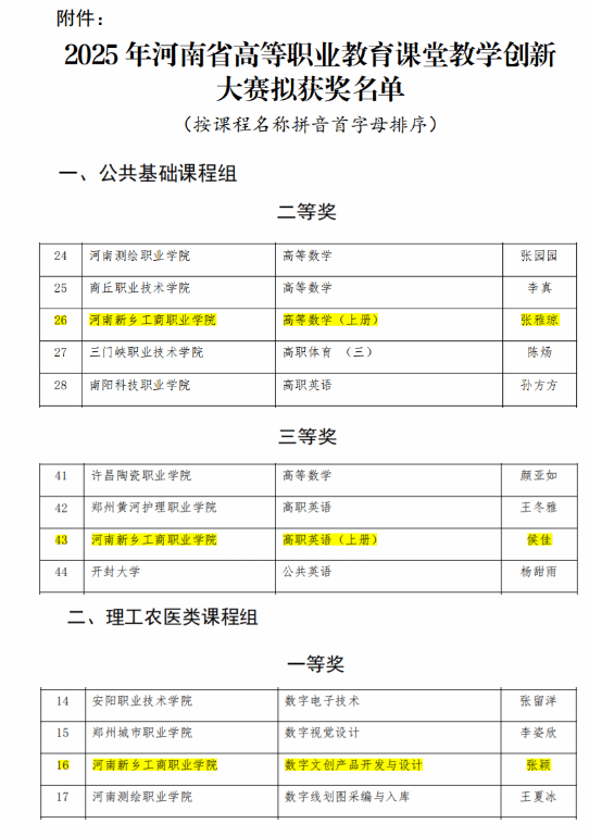 近日,2025年河南省高等职业教育课堂教学创新大赛拟获奖名单正式揭晓,我校6位参赛教师凭借卓越的教学创新能力与扎实的专业功底,在公共基础课程组、理工农医类课程组及文史财经类课程组中全数斩获佳绩,充分彰显了学校深化教学改革、强化师资队伍建设的显著成效。