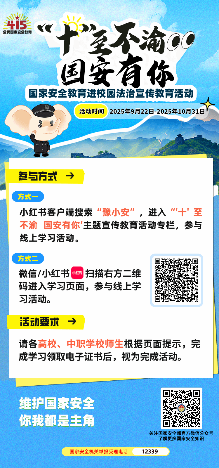 作为新时代青年,牢固树立总体国家安全观、提升维护国家安全的能力,是我们肩负的重要责任。值此《中华人民共和国国家安全法》颁布实施十周年之际,学校将国家安全教育定为本学期重点。现组织全体师生参加“‘十’至不渝 国安有你”国家安全教育进校园法治宣传教育活动,共同守护国家安全。具体事宜通知如下: