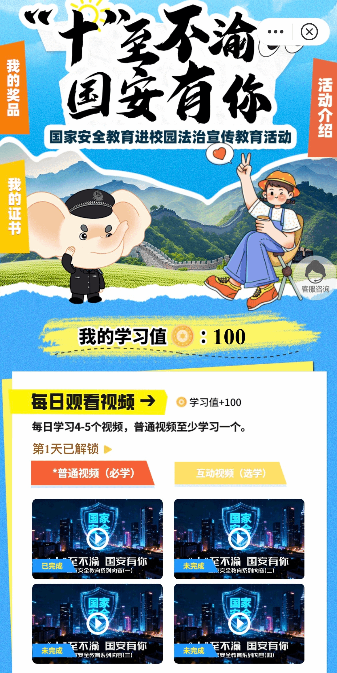 线上观看国家安全普法教育视频,增强国家安全意识和能力。参与人员在顺利完成线上学习后可领取电子证书。